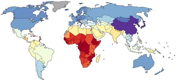 Skillnaderna kan ses på den här kartan, hämtad ur ”IQ and the wealth of nations” av Richard Lynn och Tatu Vanhanen (2002).