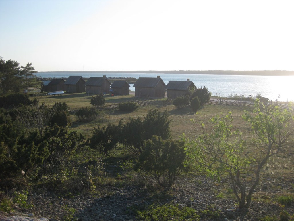 Skyddad som av en mur av låga raukar ligger skrivarstugan, enkelt murad av kalksten och med tjärat faltak och gavelspetsar, just där stenstranden övergår i en mjuk, sandig bukt bort mot nästa fiskeläge.