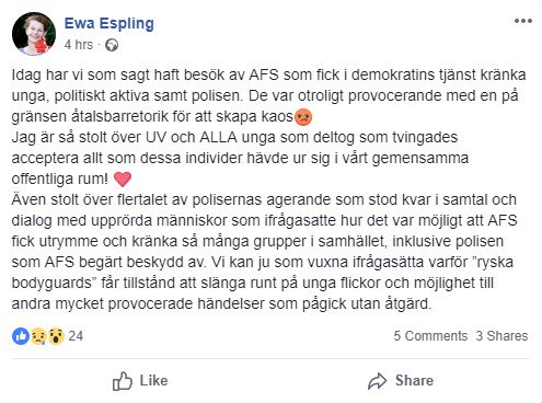 Och nu det värsta, all massmedia ljög om mötet. De intervjuade ingen av AfS eller dess sympasitörer. De undanhöll all fakta och ljög, ljög, ljög… Så trött på detta… Det är så uppenbart att vänstern styr media.