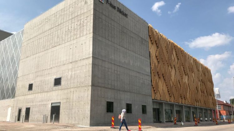 Fören på en Atlantångare på drift? Eller en tekopp i megaformat? Nej, detta är resultatet av att arkitektbyrån White fritt fått hänge sig åt sina dekonstruktivistiska impulser när de fick uppdraget att rita Humanistiska Teatern i Uppsala. Byggnadens koniskt välvda fasad är gjord av lackerad bronsfärgad aluminiumplåt, med perforering utformad av konstnären Ann Lislegaard.