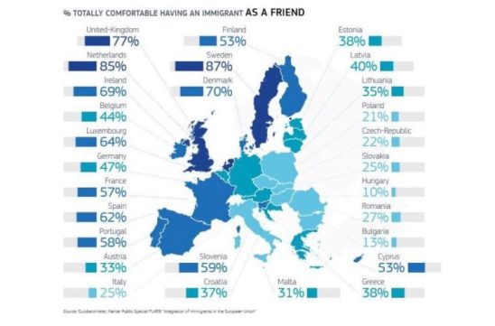 I Eurobarometern har man mätt hur villiga medborgare i olika länder är att ha en migrant som vän. Resultatet visar att svenskar är mest villiga att ha en migrant som vän. 87 procent svarar ja på frågan, medan genomsnittet i Europa är 48 procent.