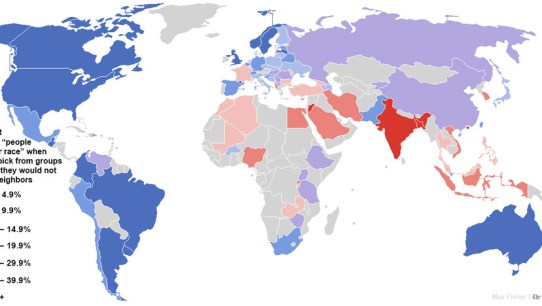 I särklass mest negativ till grannar av annan ras är man i delar av Asien: i Bangladesh var siffran 71,7 procent, Hong Kong 71,8 och Indien 43,5 procent.