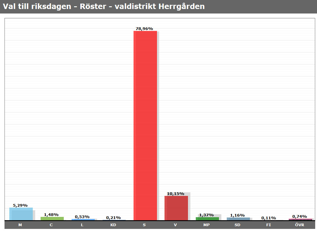 Så här röstade de boende i stadsdelen Herrgården i Malmö i senaste riksdagsvalet. (Källa: Valmyndigheten).