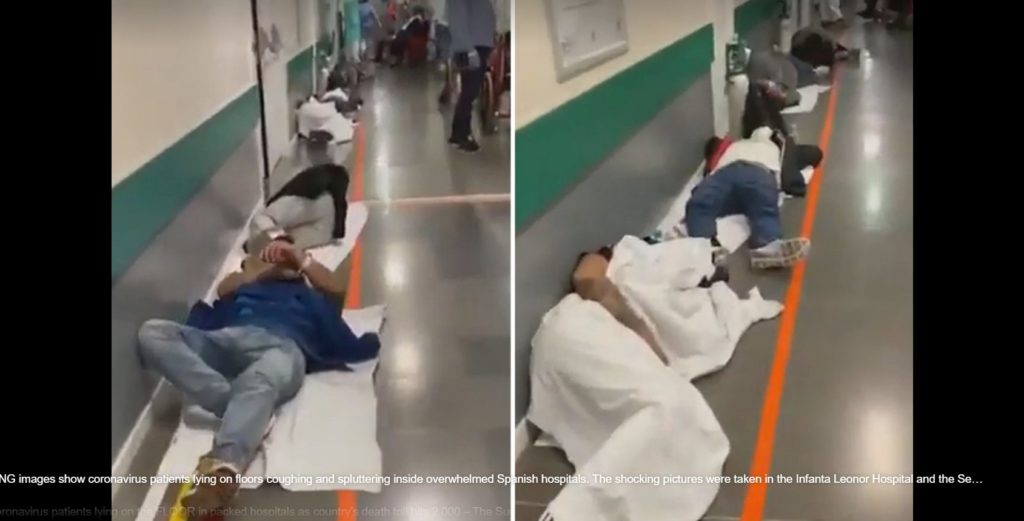 Utanför fönstren patrullerar polisen gatorna med blåljusblinkande karavaner för att kontrollera att reglerna efterlevs. I entrén till matbutiken står en vakt beväpnad med batong och släpper endast in en person per familj. Nästa gång är engångshandskar obligatoriska för alla kunder. Polisens högtalarförsedda drönare jagar hem folk från gator och stränder. Hittills rapporteras omkring 40 000 smittade, de flesta i Madrid och Katalonien. Cirka 3 400 döda. Bara det senaste dygnet dog 738 personer. Skräckbilder från sjukhus i Madrid visar patienter som ligger i rader direkt på golvet.