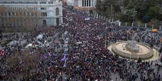 ”En bitter politisk batalj rasar redan om ansvaret för Spaniens sena uppvaknande. Enligt oppositionen bagatelliserade den regerande vänsterkoalitionen epidemins frammarsch ända till dagen efter internationella kvinnodagen, den 9 mars, då strängare åtgärder började vidtas. Den 5 mars visade hälsovårdsdepartementets sajt att antalet smittade fördubblats på ett dygn. Vissa experter rekommenderade att 8 mars-evenemangen, i en rad storstäder, sköts upp.