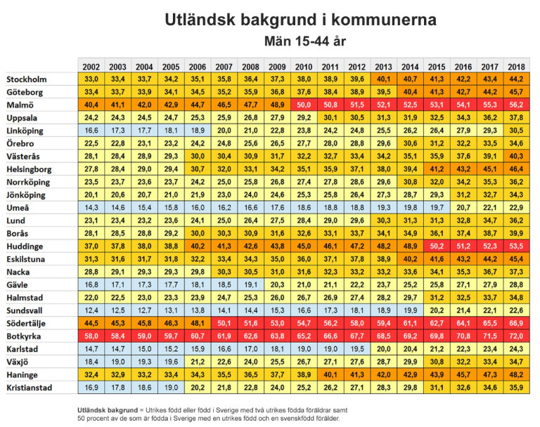 I Botkyrka utgjorde män 15-44 år med utländsk bakgrund 58 procent redan 2002. 2018 hade gruppen vuxit till hela 72 procent.