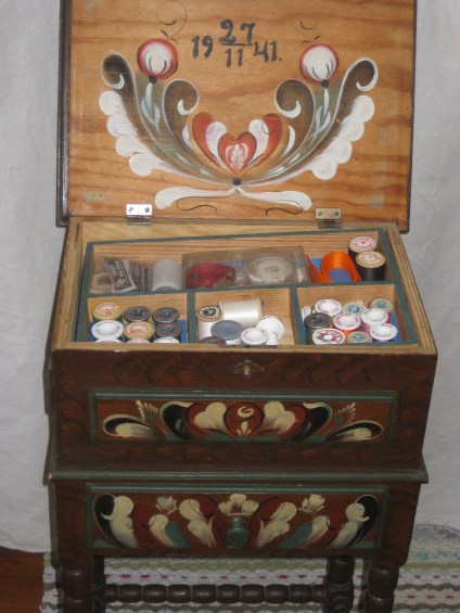 Pappa vet inte vad han ska svara. Hur förklarar man lycka för ett treårigt barn? Till slut säger han att lycka är ”allt möjligt”. Då vet jag precis. Jag associerar till mammas sybord med kurbitsmotiv på locket. Bordet som pappa köpte som 19-åring för att han hoppades få en sykunnig fru. Där finns allt möjligt; sytrådsrullar, strumpebandsknappar, resårband, säkerhetsnålar, moulinégarn och mycket annat. Med barnets logik är lycka alltså ett sybord.