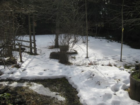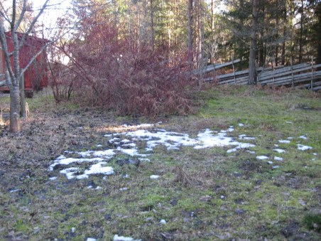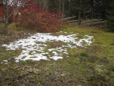 Den 15 mars faller ett lätt regn på morgonen. Nu ska väl den ihärdigaste snöfläcken ändå ge upp! Och visst blir den anfrätt i kanterna. Nu är den bara en skugga av sitt forna jag. Men ge upp – icke! Inte än. Den fortsätter att kämpa emot. Nu är den bara små tjuriga fläckar.