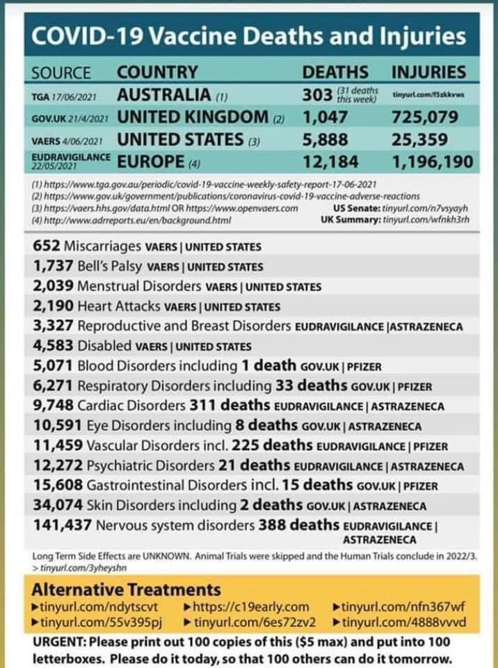 Observera att biverkningar som inrapporteras till till exempel det amerikanska biverkningsregistret VAERS enbart uppskattas motsvara en eller några få procent av det verkliga antalet. Det är värt att notera att Europa har det största antalet rapporterade skador och dödsfall, vilket antagligen innebär att Europa har en bättre biverkningsrapportering än framför allt USA. Men utöver siffrorna här nedanför finns alltså ett mycket stort mörkertal.