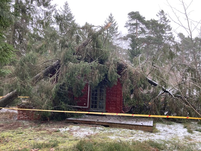 Det har känts tryggt – ända tills en flera ton tung granbjässe slets upp med rötterna och fälldes av vinterns storm. Tungt föll den på mitt tak och knäcktes på mitten. Som en tändsticka.
