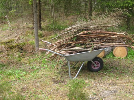 Till min hjälp kommer duktige Alrik med motorsågen och – svisch! – fäller han de träd jag har märkt ut med röda plastband och sågar bort döda grenar. Jag fortsätter att släpa grenar. Nu blev de ännu fler. Skottkärran fylls varje dag.