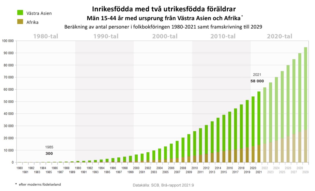 I åldersgruppen 30-34 år har mellan var fjärde och var tredje son till invandrare från icke-västliga länder lagförts för brott i Brottsbalken. Problemen går i arv, också när den ena föräldern är född i Sverige, och personen ifråga räknas som svensk.