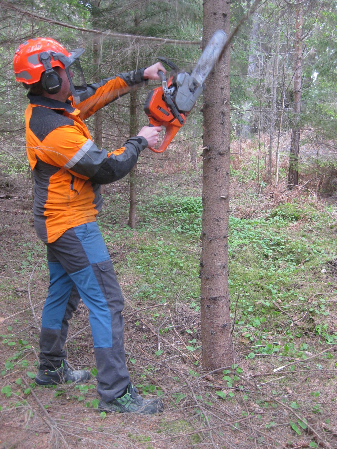 Till min hjälp kommer duktige Alrik med motorsågen, en av alla dessa män med sina fantastiska maskiner, och – svisch! – fäller han de träd jag har märkt ut med röda plastband och sågar bort döda grenar.