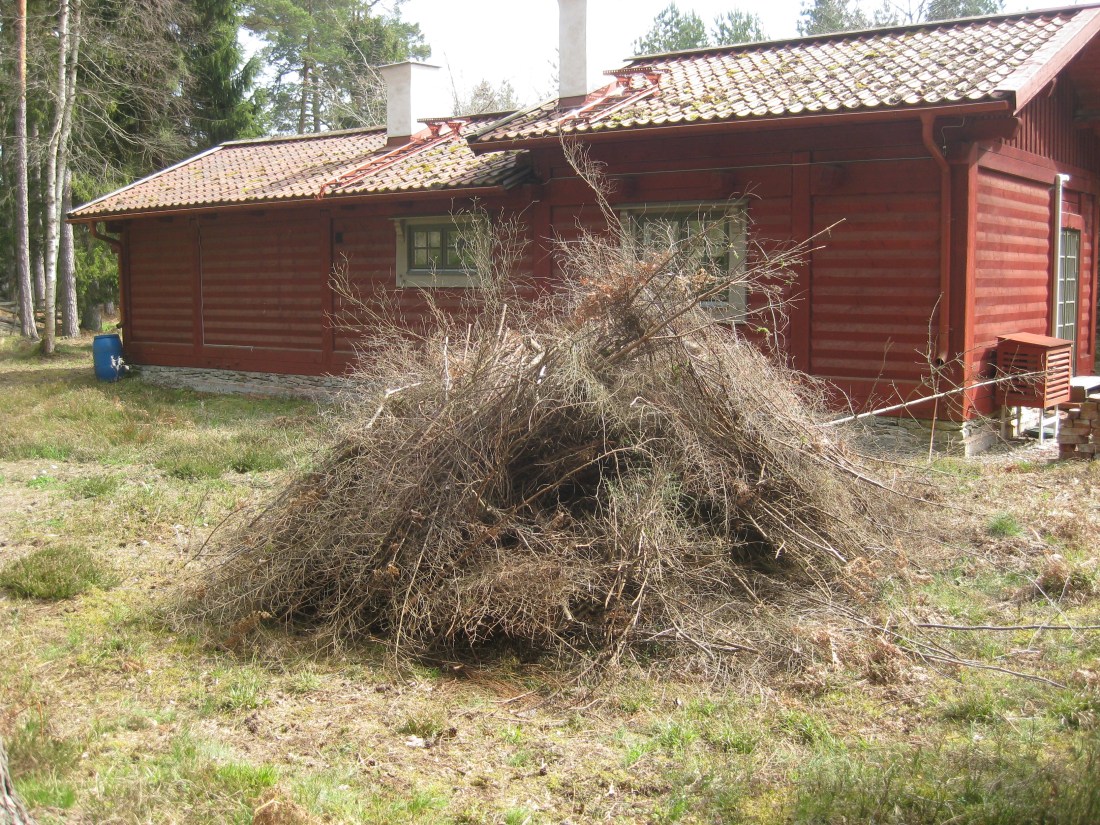 Jag håller fast i skottkärran eller håller greppet om så många grenar i taget jag kan. Lägger dem på en stor hög som Alrik ska frakta bort med traktor. Gren- och rishögen växer sig allt högre och tär på mitt estetiska sinne. Den har sjunkit ihop under vintern men ser skräpig ut. Den är en majbrasa som aldrig kommer att brinna, för här råder extrem torka och därmed brandfara.