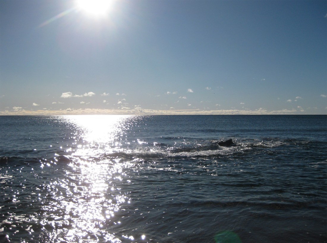 Jag sätter mig på den vanliga klippan, fast det är kallt om baken. Sitter länge och betraktar havet, vänder ansiktet mot solen. Vattnet står högt och når nästan mina fötter.