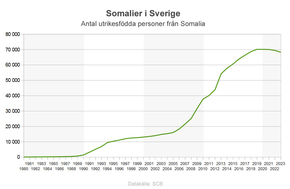 1980 fanns bara etthundra somalier i Sverige. De har snabbt ökat i antal, både genom invandring och barnafödande, och uppgår nu till cirka 100 000. Drygt en tredjedel, 35 300, är födda i Sverige av somaliska föräldrar. Datakälla: SCB.