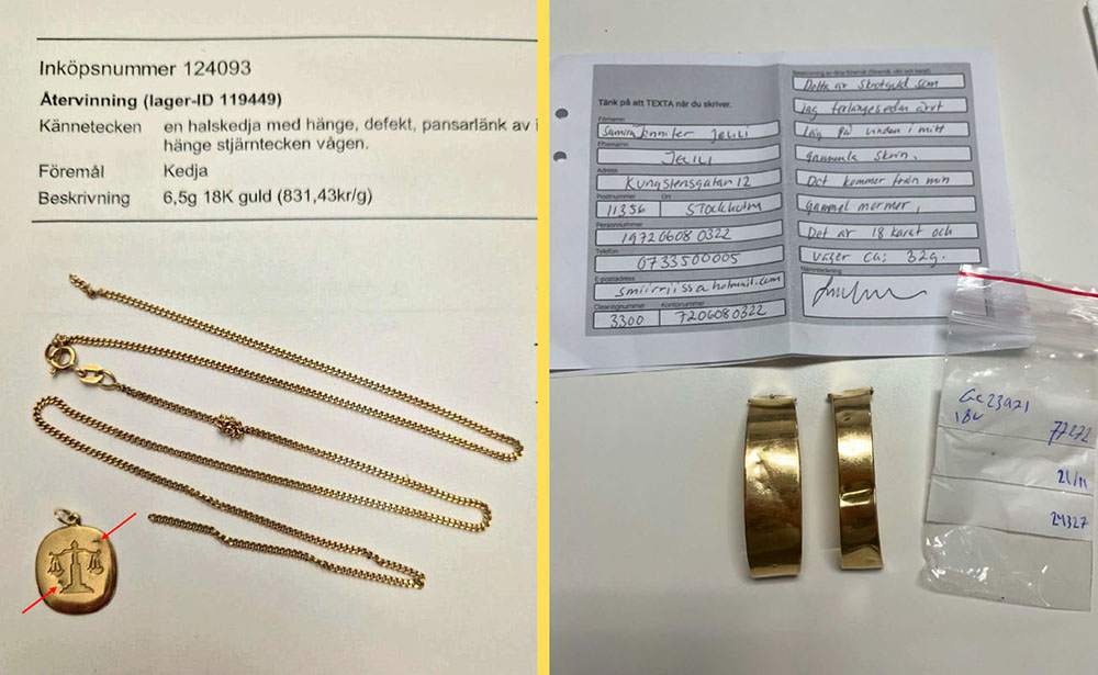 Armbanden och ett guldhjärta återfinns av Polisen hos firman Finguld, där de är inlämnade för försäljning.